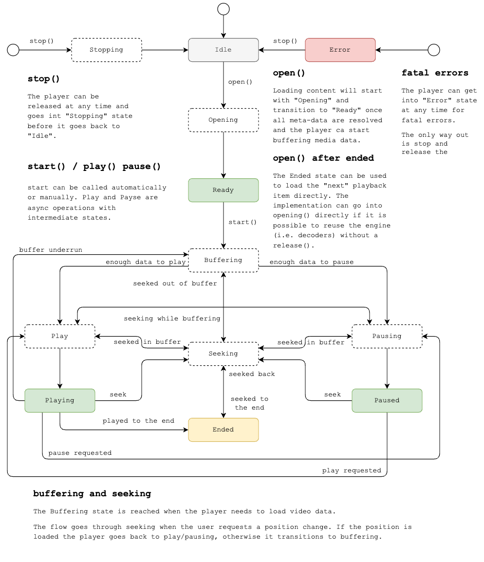 .idlestate when no content is loaded or being loaded and no additional resources are open. No data is loaded in buffers and no decoder instances are open. This is the initial state of the Player.Buffering: The player does not have enough data to keep in playing and need to fill its buffers further before playback can continue